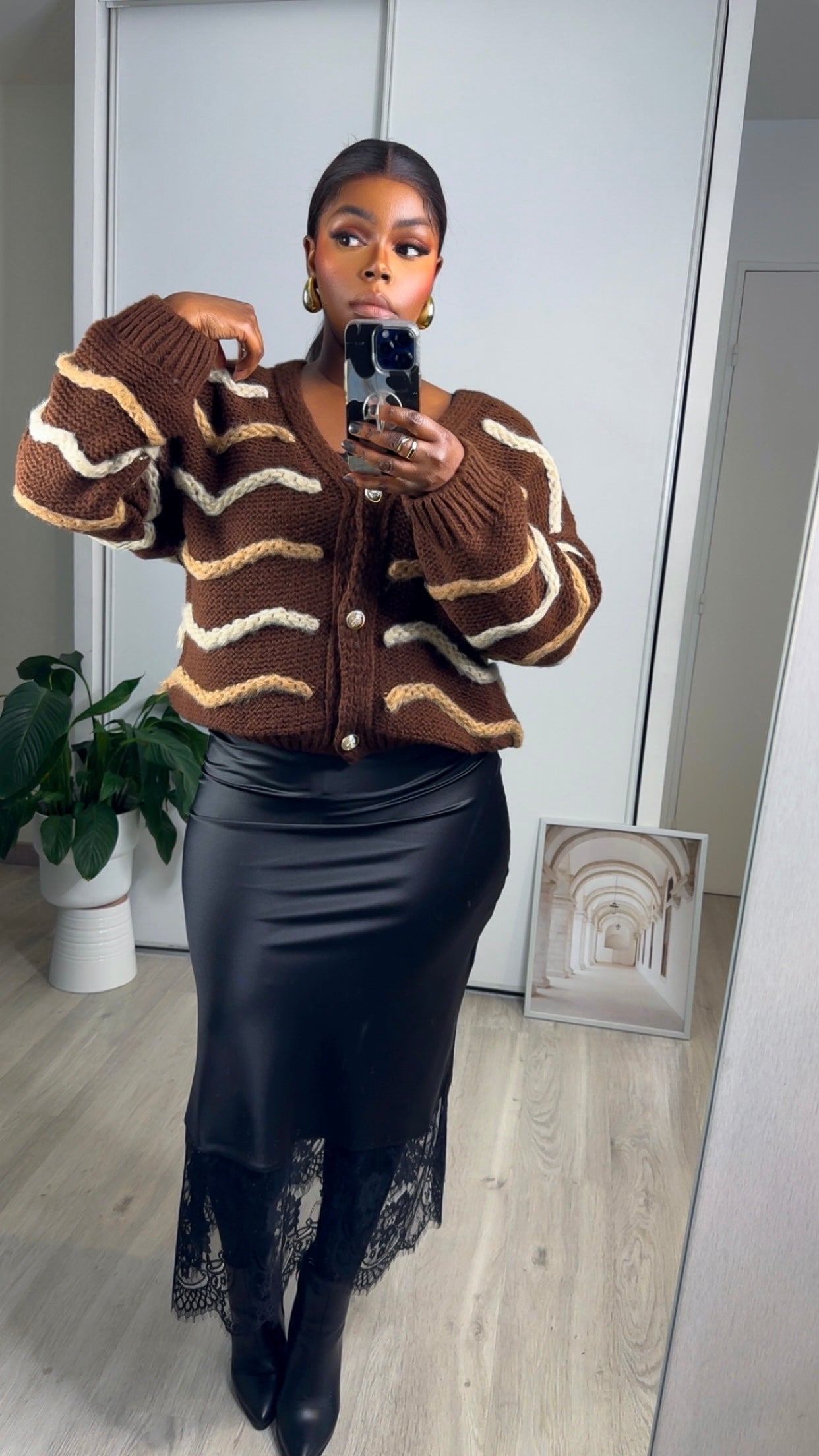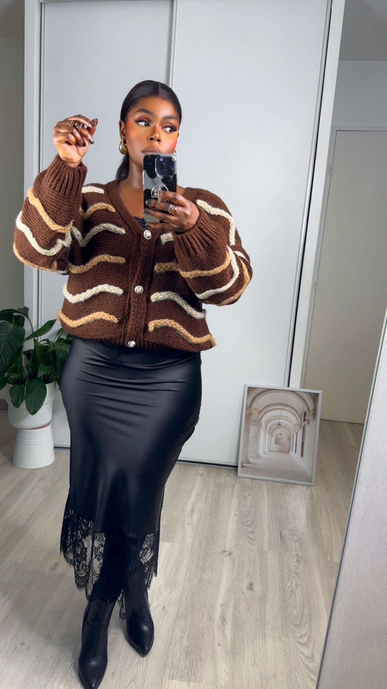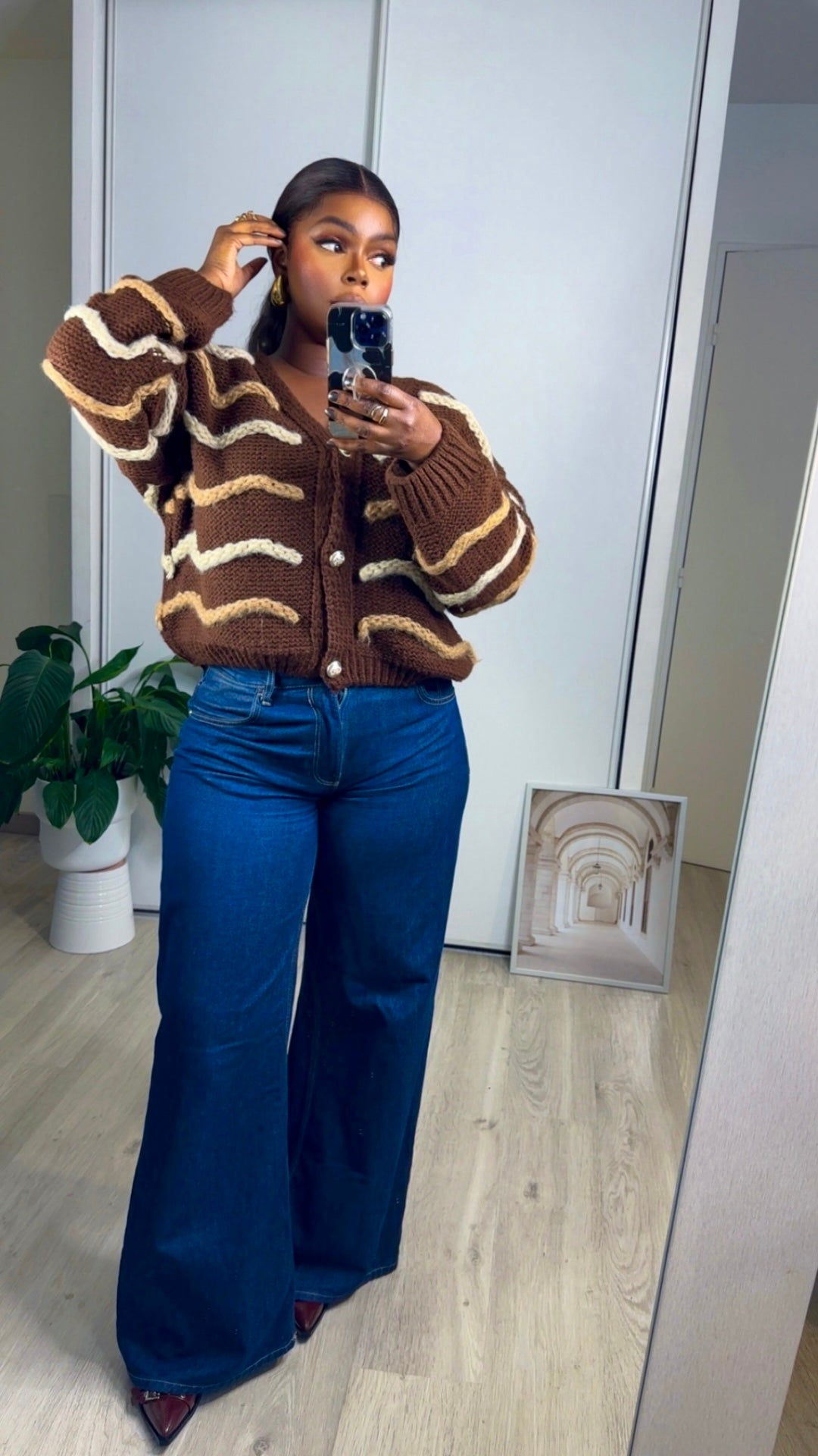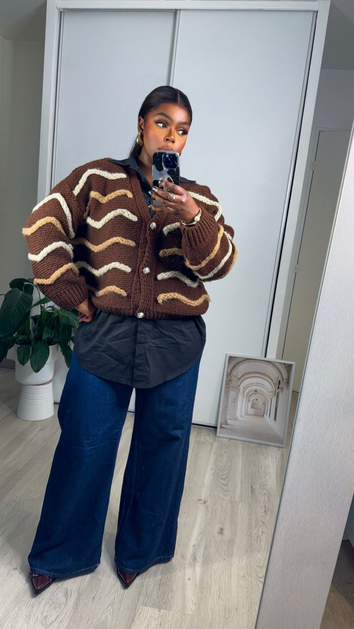 Ce cardigan oversize en maille épaisse combine confort et style avec ses rayures texturées beige et marron. Parfait pour la mi-saison, il ajoute une touche de chaleur et de caractère à n’importe quelle tenue.