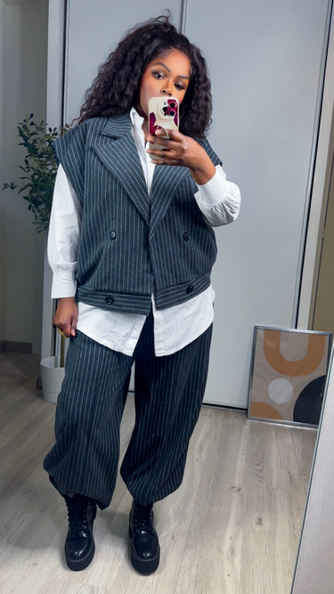 Ensemble deux pièces composé d’un gilet sans manches à col tailleur et d’un pantalon fluide à rayures fines. Sa matière épaisse et de qualité offre une tenue parfaite, loin des ensembles tailleur classiques trop fins. Le pantalon taille unique, doté d’une taille élastique, s’adapte confortablement aux morphologies du 36 au 44.