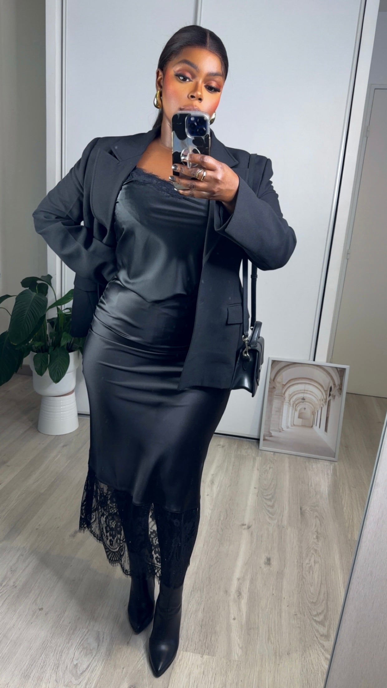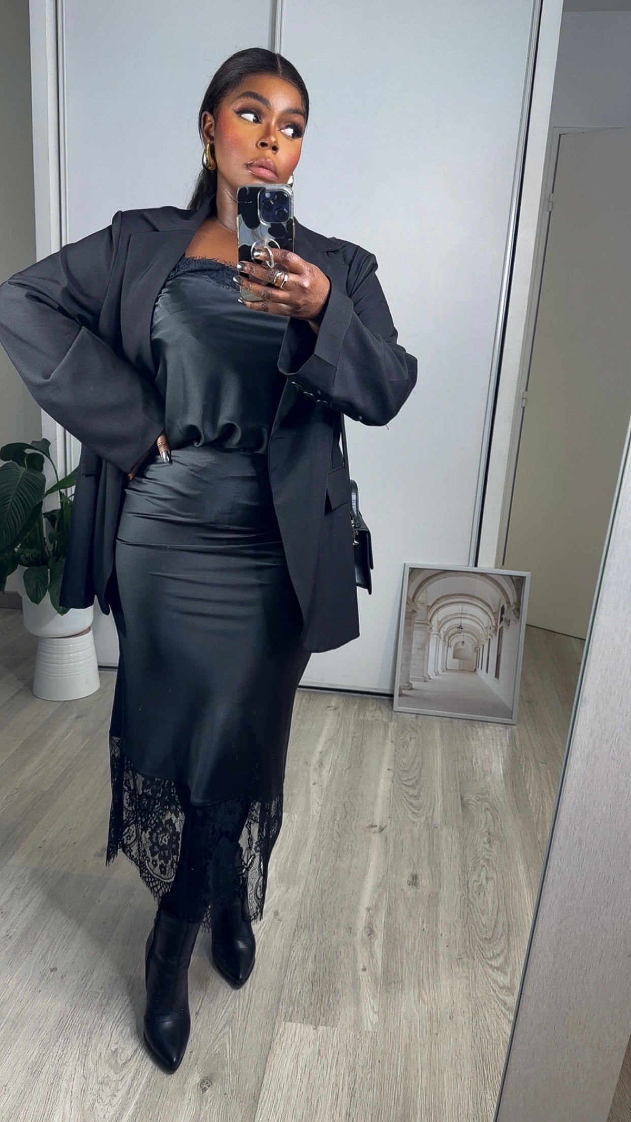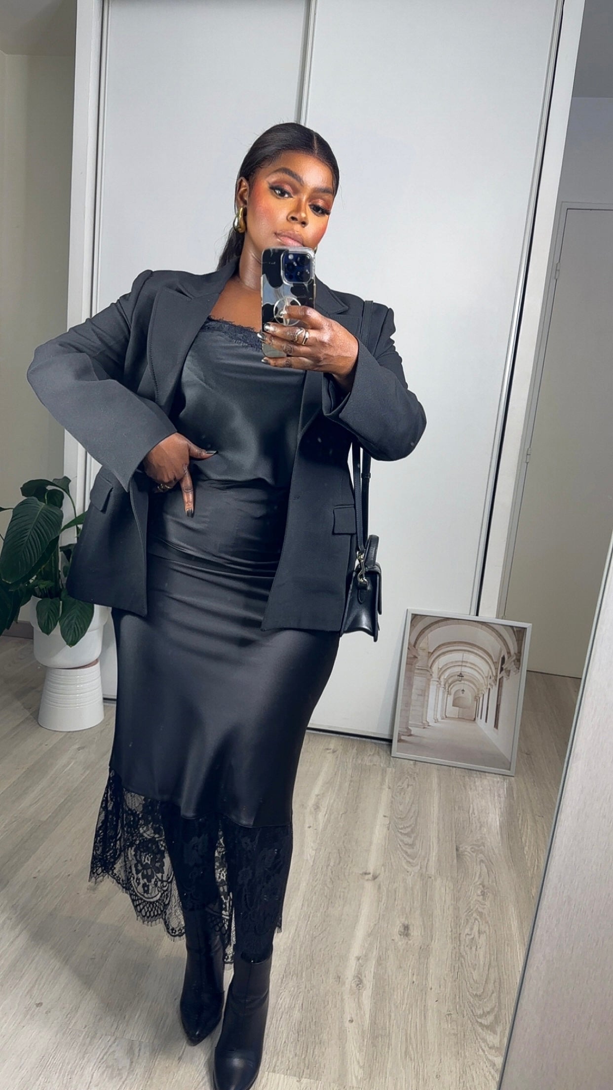Élégance et féminité se rencontrent dans cette jupe satinée noire au tombé fluide. La finition dentelle en bas de jupe apporte une touche sensuelle et raffinée.
